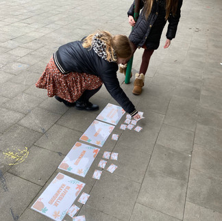 In het vierde leerjaar oefenen we de verschillende woordsoorten zoals lidwoorden, werkwoorden, zelfstandige naamwoorden en bijvoeglijke naamwoorden. Nadat we flink gewerkt hadden in onze werkboek, gingen we naar buiten om bewegend te leren. We kregen allerlei kaartjes met woorden die we bij de juiste woordsoort aan de overkant moesten leggen. We kregen er zelfs warm van!